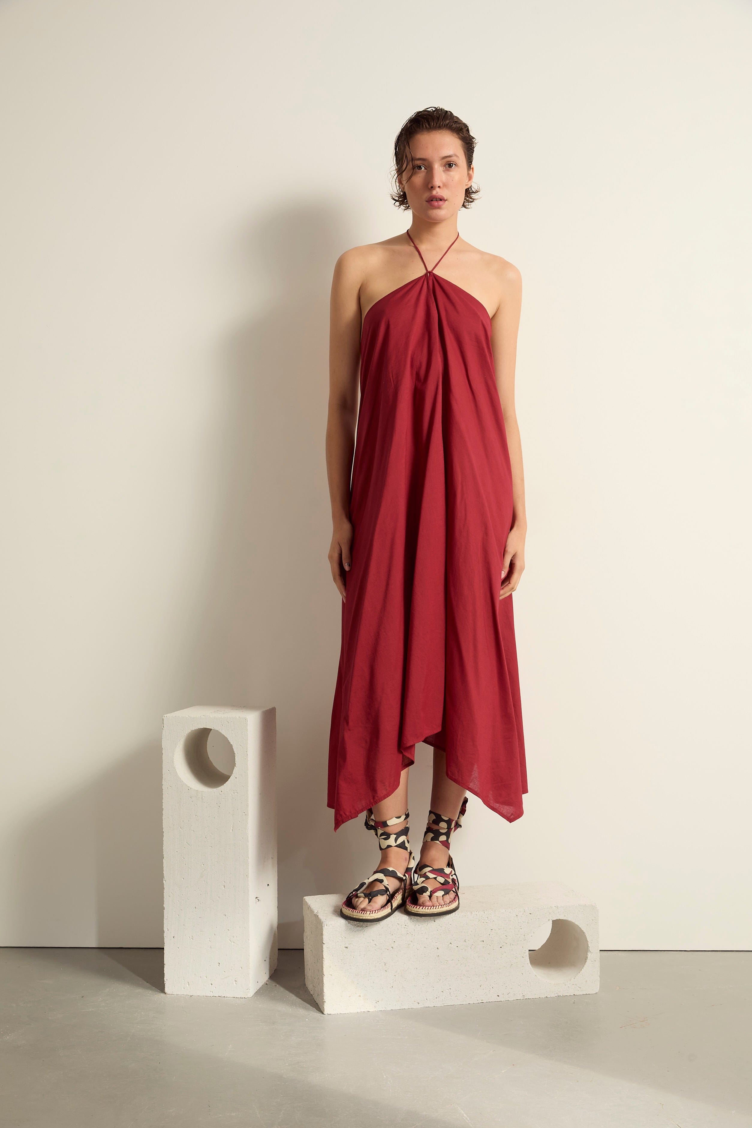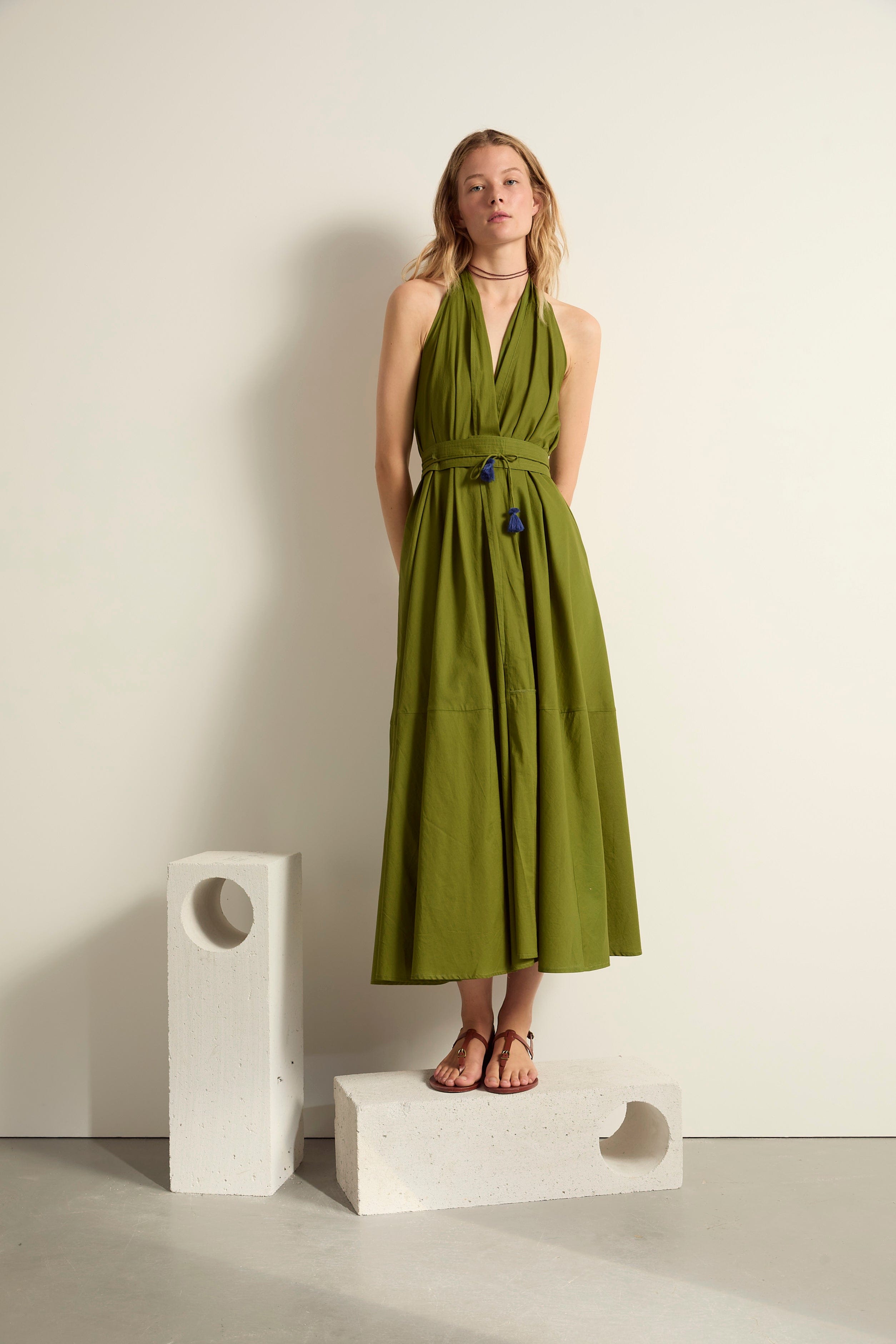 Inspired by Madeleine Vionnet's 1920s scarf dress with two crepe panels sewn and tied together, the Ivina dress is the most versatile piece in the Mare Di Latte wardrobe. An elegant dress cut from silk or cotton, as feminine over a bikini as it is belted to go to dinner... its ties at the neck falling in sophisticated pompoms at the back. A clean cut, clean and architectural lines. To slip into any good summer suitcase.